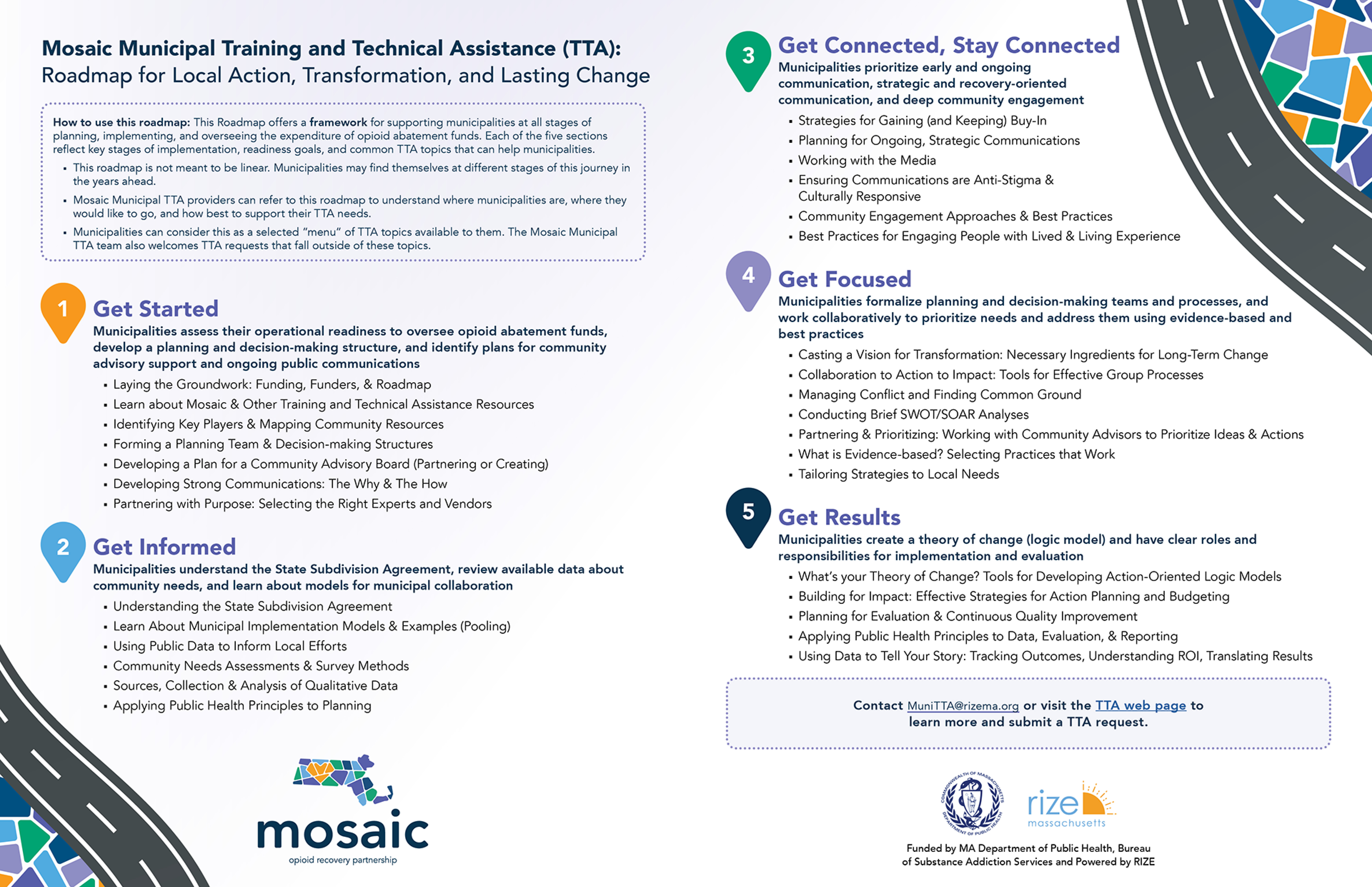 Mosaic’s Municipal Training and Technical Assistance (TTA) Program uses a hub-and-spoke model designed to provide individualized, responsive support grounded in local knowledge. RIZE, the “hub,” provides a consistent framework, tools, training, and resources that municipalities can use to manage and maximize their opioid abatement funds. This shared foundation ensures that every municipality, regardless of size or capacity, has access to clear guidance and practical support. At the same time, each region has a dedicated regional coordinator, the “spoke,” who works directly with municipalities and understands the unique circumstances, challenges, and priorities of the communities they serve.